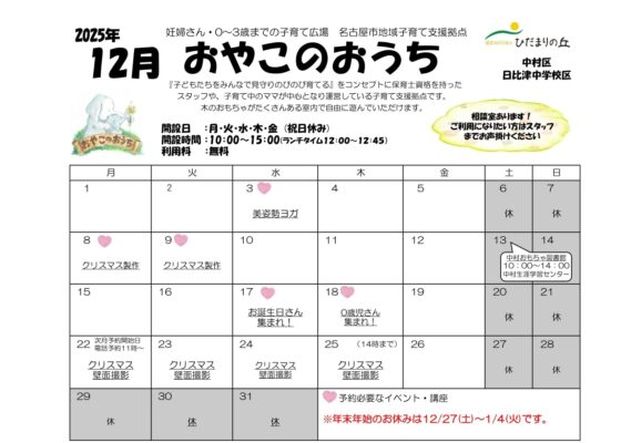 日常の何気ない、かわいい子どもたちの姿や保育士たちの保育の工夫、 イベント情報などをお届けしてます。 ☆おやこのおうち☆11月イベントの様子✨ 2025.11.28 こんにちは! 名古屋市地域子育て支援拠点 おやこのおうちです😄 今… VIEW MORE ♦おひさまのおうち♦どろんこおひさま㏌細米公園🌞 2025.11.26 こんにちは😊 名古屋市地域子育て支援拠点おひさまのおうちの鳥井です🎵  … VIEW MORE ♡ぽかぽかひろば♡ 2025年12月イベントカレンダー 2025.11.21 こんにちは✨ 名古屋市中村区子育て応援拠点 ぽかぽかひろばです🧡 … VIEW MORE ♦おひさまのおうち♦12月のイベントカレンダー 2025.11.20 こんにちは😊 名古屋市地域子育て支援拠点おひさまのおうちです🌞 12月のイベント… VIEW MORE ☆おやこのおうち☆12月イベントカレンダー🎄 2025.11.20 こんにちは✨ 名古屋市地域子育て支援拠点 おやこのおうちです😄 1… VIEW MORE ♡ぽかぽかひろば♡11月一時預かりキャンセル待ち空きあります! 2025.11.18 こんにちは 名古屋市中村区子育て応援拠点 ぽかぽかひろばです🧡 一… VIEW MORE ♡ぽかぽかひろば♡ 自分の子どもは他人?!講座の様子♪ 2025.11.15 こんにちは 名古屋市中村区子育て応援拠点 ぽかぽかひろばです🧡 先… VIEW MORE ♡ぽかぽかひろば♡ 赤ちゃんようこそ『沐浴」の様子☆ 2025.11.15 こんにちは 名古屋市中村区子育て応援拠点 ぽかぽかひろばです🧡 先… VIEW MORE ☆おやこのおうち☆保健師相談デーの様子✨ 2025.11.14 こんにちは! 名古屋市地域子育て支援拠点 おやこのおうちです😄 来… VIEW MORE 運動会ごっこ : こびとのおうち 2025.11.14 こんにちは! 11月7日に令和7年度の運動会ごっこを開催しました🏃… VIEW MORE 投稿のページ送り 1 2 3 4 5 6 … 164 >