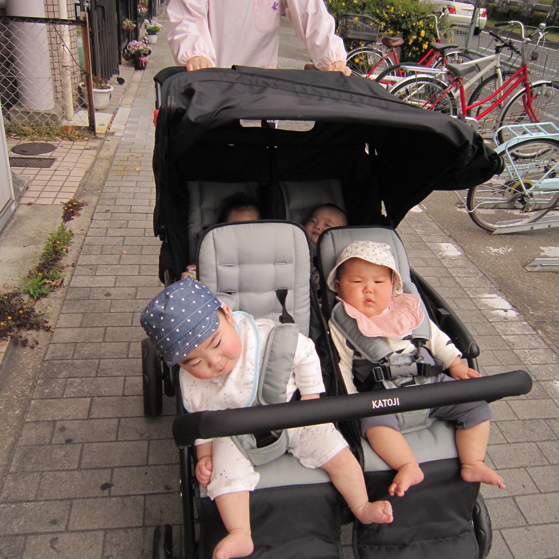 ●ほし組さん(0才児)は、保育室でゆったり過ごしたり、ベビーカーでお散歩に出かけたりしています。