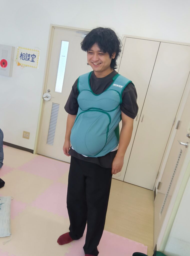 産まれたころくらいの重さの赤ちゃん人形で実際に抱っこ体験をしてもらったり、パパに妊婦ジャケットをつけてもらって、今のママの体の漢字を体験してもらいました☆