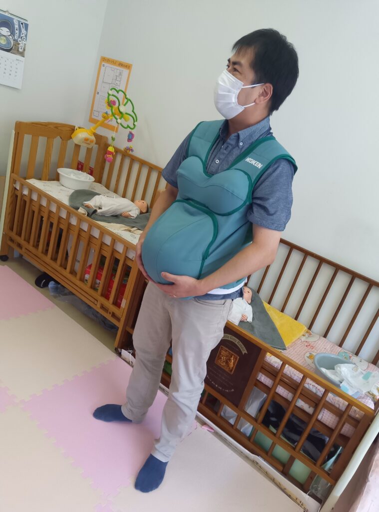 産まれたころくらいの重さの赤ちゃん人形で実際に抱っこ体験をしてもらったり、パパに妊婦ジャケットをつけてもらって、今のママの体の漢字を体験してもらいました☆