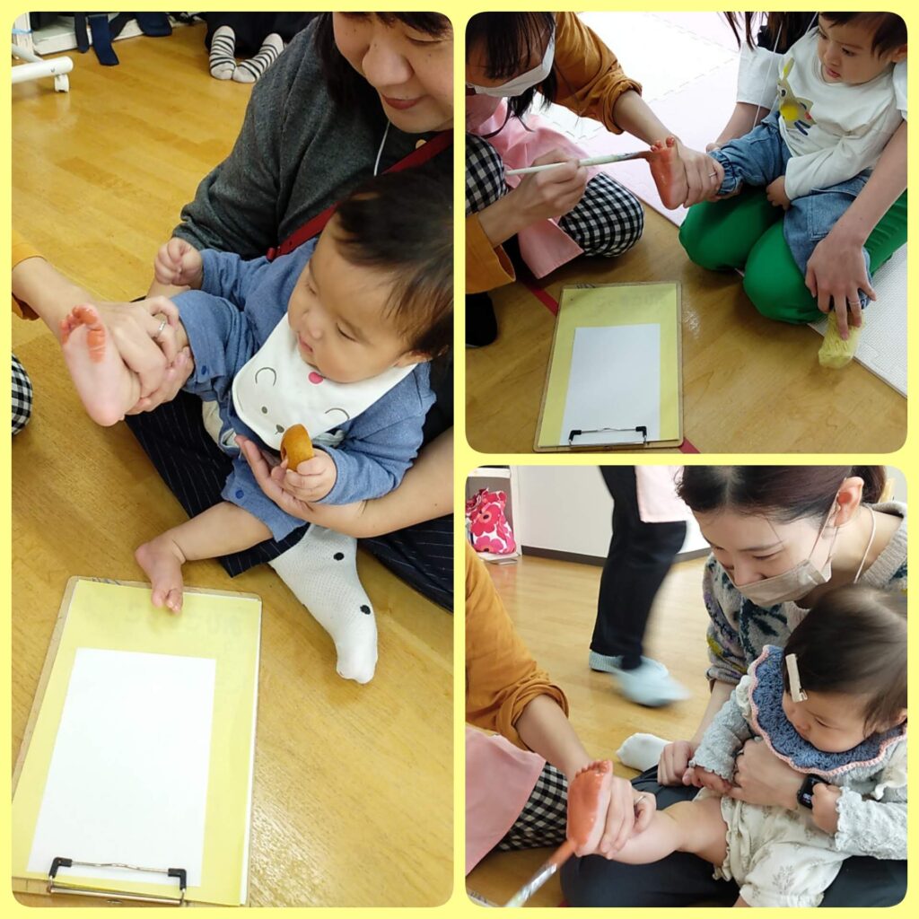 筆を使って絵具をぬりぬりしてもらい、くすぐったかったね!!