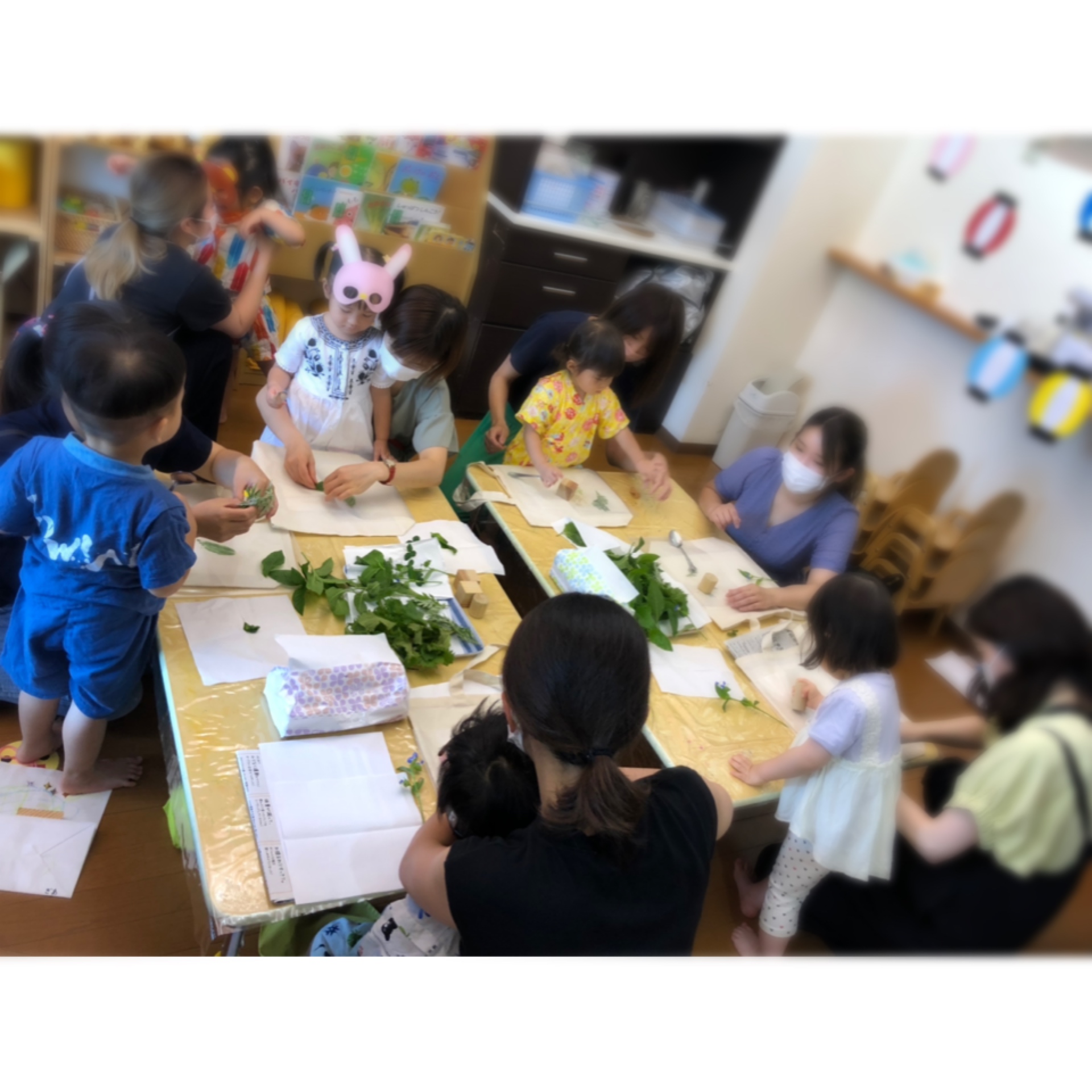 次に、保育室で育てた『たで藍』や、近くで採ってきた草を使った『草木染め』をしました。