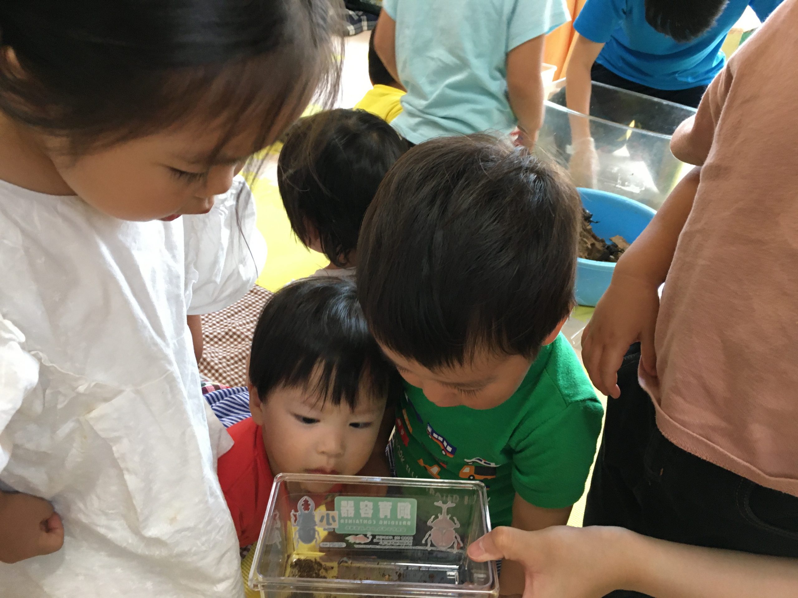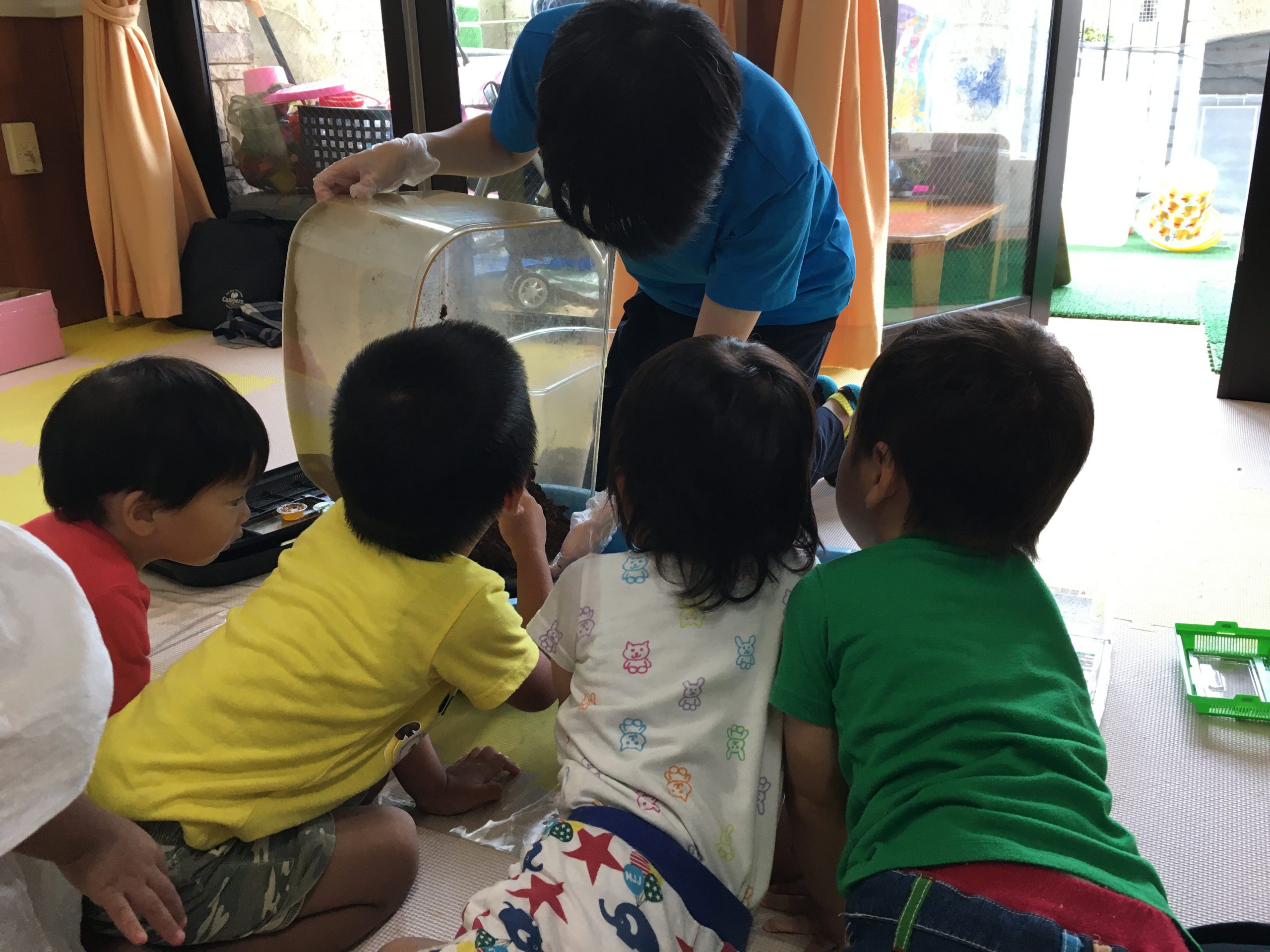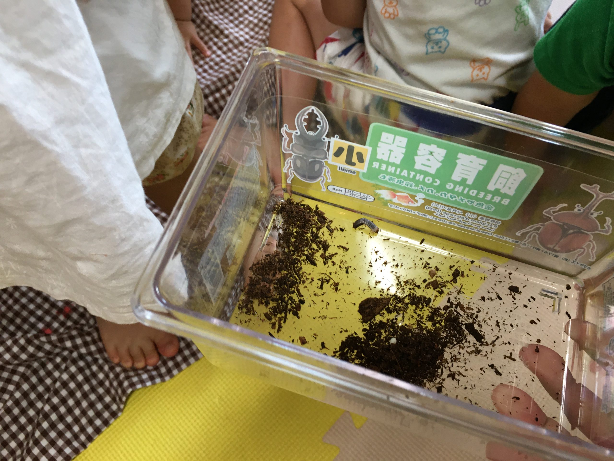 - あいわ保育園からかぶと虫を分けてもらっていたのですが、今日はあいわ保育園の先生がかぶと虫の様子を見に、また子どもたちにかぶと虫のお話をしにひだまりに来てくださいました。