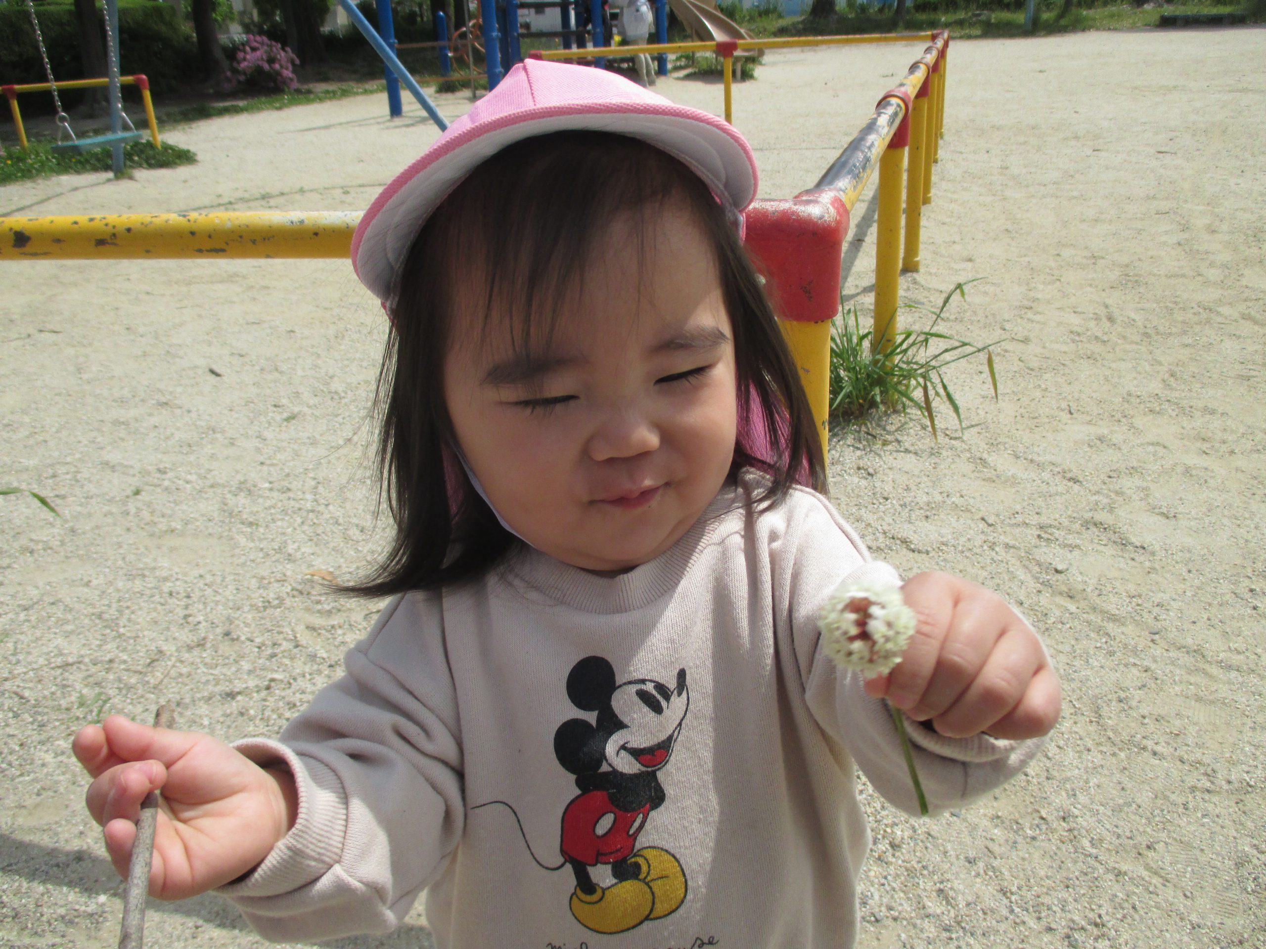 公園ではクローバーやかわいいお花をみつけたり