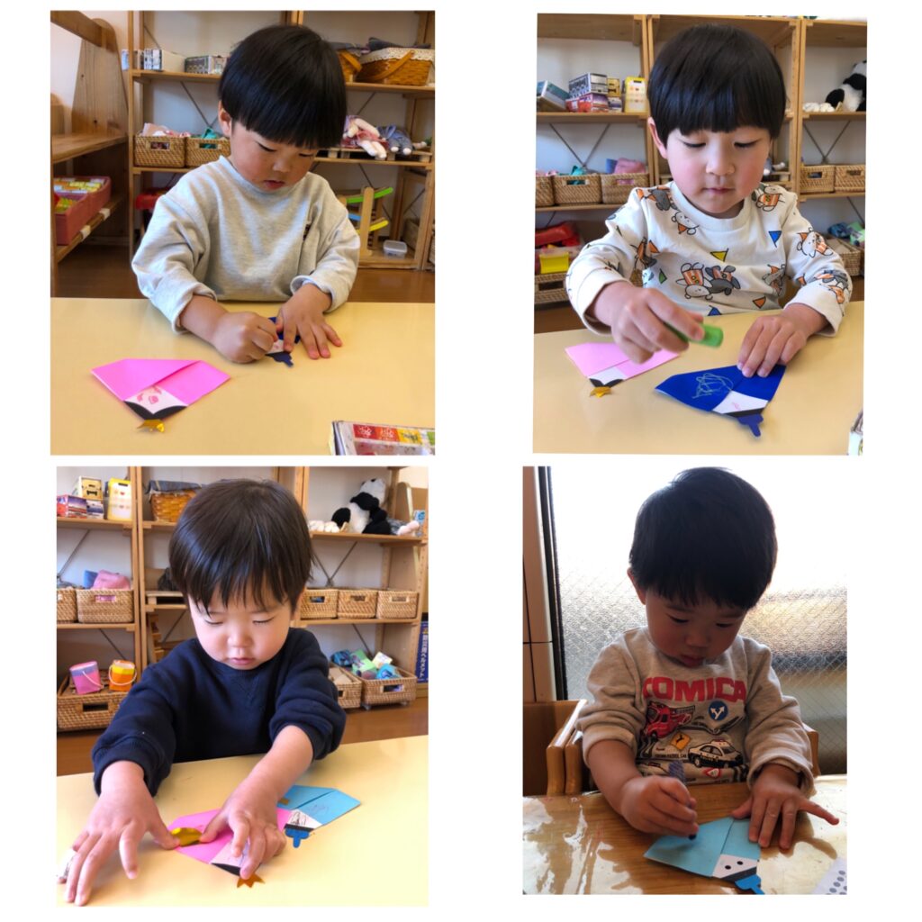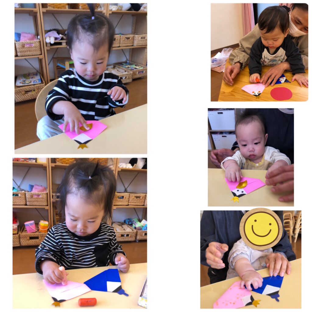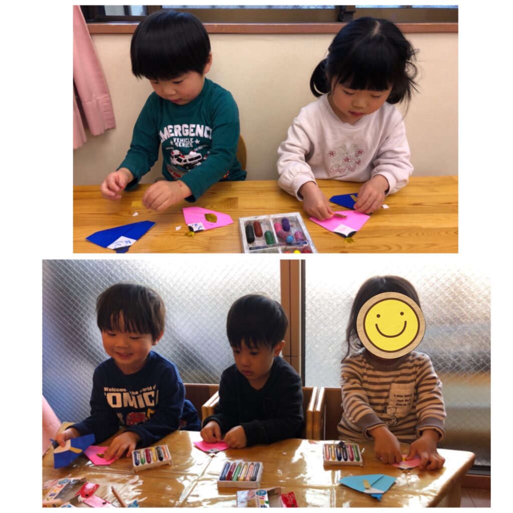 折り紙で作ったおだいりさまとおひなさまにお顔を描き(ほし組さんはシール貼り)、冠と笏を貼っていきます。丸めたお花紙でぼんぼりも作りました。