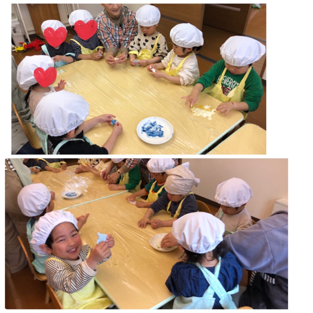 パネルシアターの後は給食の先生と一緒に、この地域の伝統菓子である「おこしもの」作りもしました。