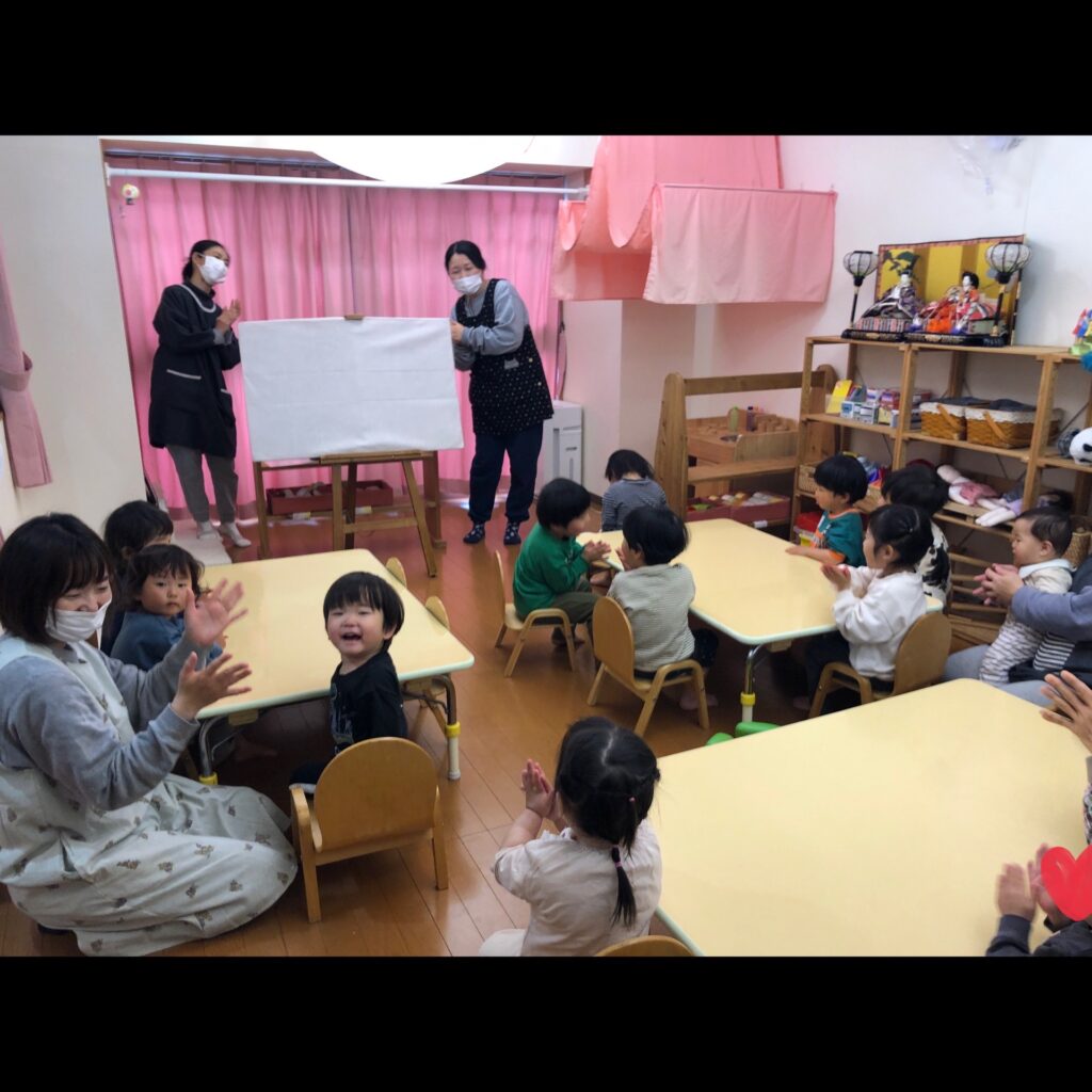 「おひなさまはどこ?どこ?」とキョロキョロ探す仕草をしたり、動物のおひなさまを指さして「なんかおかしいよ〜」とお友だち同士で笑い合ったり、みんな楽しそうに観てくれていました👀