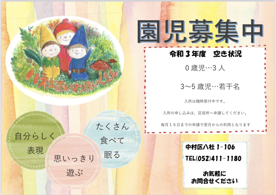 こんにちは、 八社あいわ保育園です!