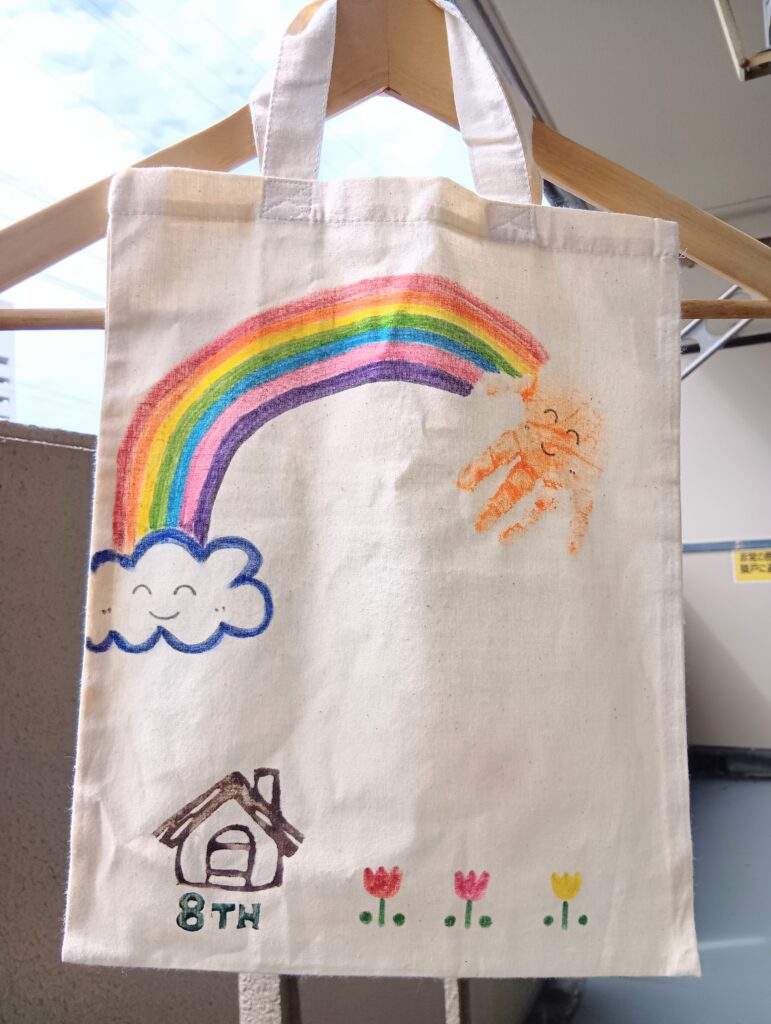 おひさまのお家にちなんで太陽に見立てたお子さまの手形スタンプを押して、布ペンで自由に絵を描いていただきオリジナルのトートバッグを製作していただきます✨